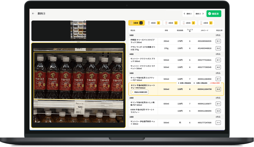 商品棚の画像をアップロードするだけで、陳列商品を自動で認識して売場をデータ化。本部と店舗間のコミュニケーションをスムーズにし、本部からの棚割やPOSの売上データなどとマッチングして、売上実績に基づいた最適な棚割への改善も支援します
